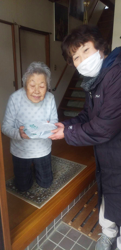 弁当を作る栄養士と調理員から配達する民生児童委員へそして地区の皆さんへ温かい弁当と共に笑顔のバトンタッチで地域との絆を深めています。